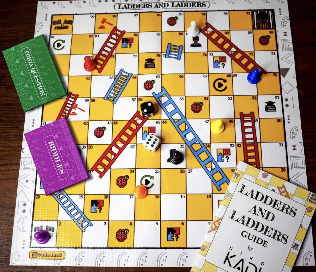 Ladders & Ladders takes the nostalgic joy of childhood board games and flips it into something fresh, clever, and wildly fun. Climb blue ladders, drop down red ones, answer trivia, solve riddles, dodge doom squares, and outsmart everyone at the table.